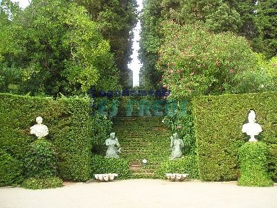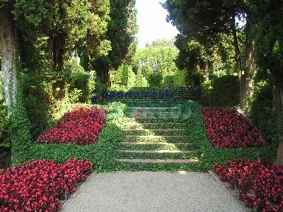 En los ejes principales del jardín (las tres escaleras que bajan hacia la placeta central) y en la explanada superior, la vegetación adquiere una función tanto estética como arquitectónica, al mismo tiempo que escultórica. Las vallas vegetales formadas por cipreses conforman paredes que canalizan la visión del espectador, para subrayar distintas panorámicas, como la bajada hacia el mar, potenciada por la presencia de las sirenas y los surtidores de agua.